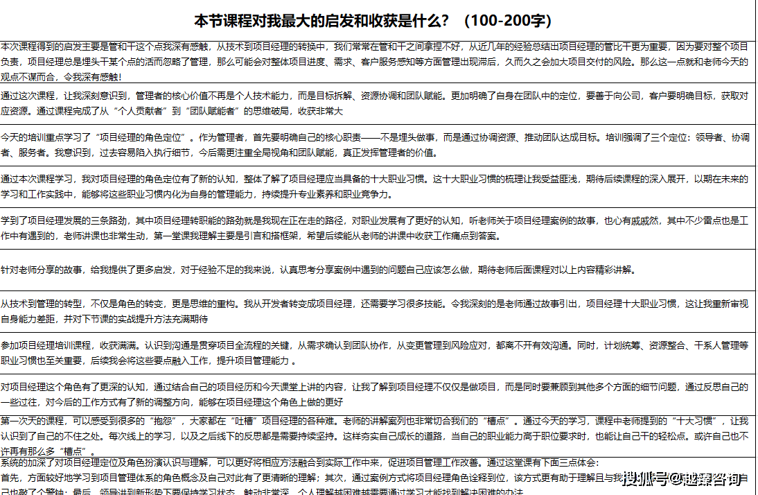 为确保线上学习效果,越臻咨询创新采用 “直播授课 + 实时互动 + 课后实操” 的模式:每期直播课程设置 “案例拆解”“分组讨论”“在线答疑” 环节,讲师通过屏幕共享演示工具操作、实时点评学员作业;课后布置针对性实操任务,要求学员结合所在项目的实际情况制定管理方案,并由越臻咨询导师团队提供 1 对 1 指导反馈。此外,训练营还搭建了专属学习社群,方便学员随时交流经验、分享困惑,形成 “学习 - 实践 - 反馈 - 提升” 的闭环。